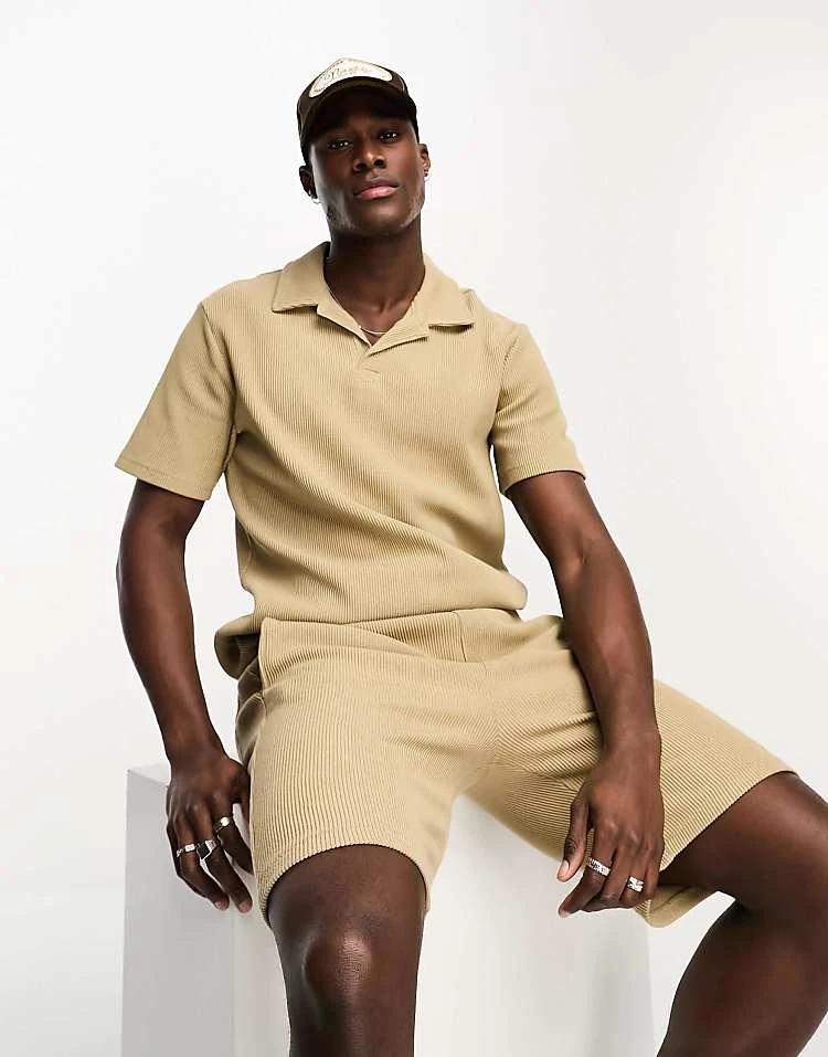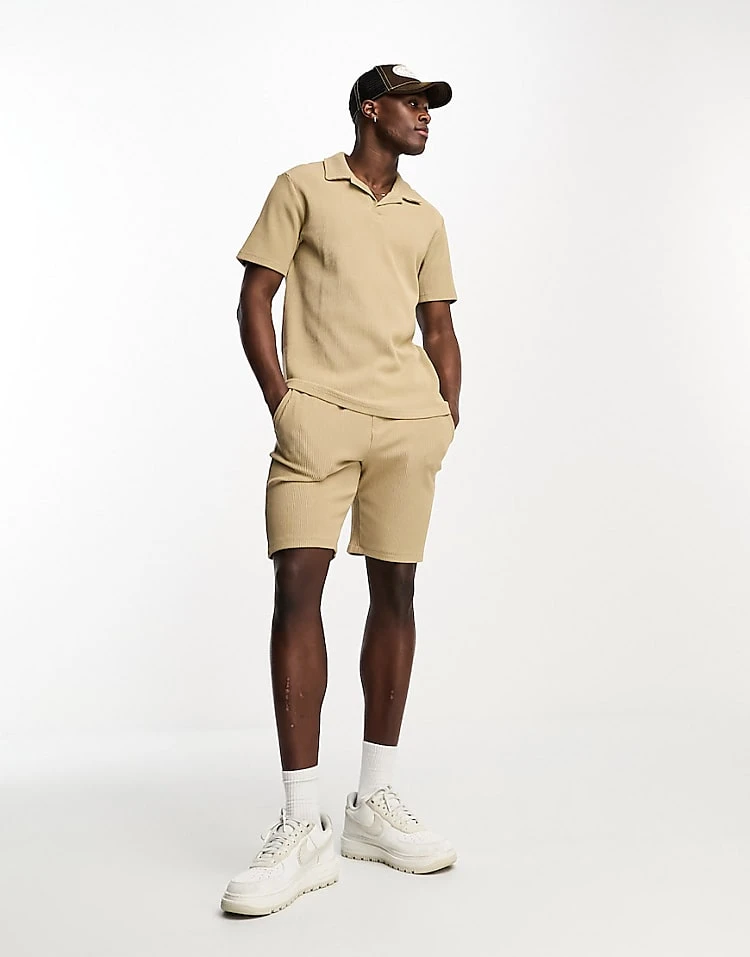 Only & Sons Ribbed Polo & Short Co-ord In Beige